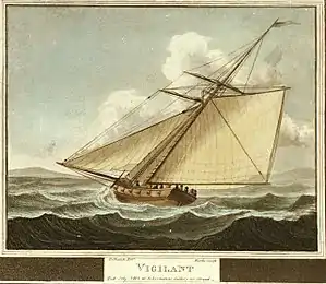 The next day, His Majesty's sloop Cygnet was anchored at Prince Rupert's Bay, Dominica, when Robert Bell Campbell, Cygnet's captain, received information that a cutter and a schooner were nearby. He immediately made the appropriate signals to HMS Wasp, which was entering the bay.[3]
