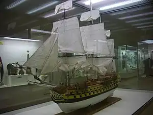 On 2 May 1780,[1] she departed Brest with a 7-ship and 3-frigate Expédition Particulière under Admiral Ternay, escorting 36 transports carrying troops to support the Continental Army in the War of American Independence. The squadron comprised the 80-gun Duc de Bourgogne, under Ternay d'Arsac (admiral) and Médine (flag captain); the 74-gun Neptune, under Sochet Des Touches, and Conquérant, under La Grandière; and the 64-gun Provence under Lombard, Ardent under Bernard de Marigny, Jason under La Clocheterie and Éveillé under Le Gardeur de Tilly, and the frigates Surveillante under Villeneuve Cillart, Amazone under La Pérouse, and Bellone.[2] Amazone, which constituted the vanguard of the fleet, arrived at Boston on 11 June 1780.[3]