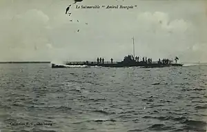 Amiral Bourgois, named for the naval architect and admiral, Siméon Bourgois, who had designed the first French submarine Plongeur,[7] was ordered on 31 December 1906 from the Rochefort Naval Base (Arsenal de Rochefort). She was laid down on 19 May 1908 and was launched on 25 November 1912. Her diesels had been ordered on 15 January 1906, but did not arrive until 4 May 1912 and proved very unreliable in service, seriously delaying completion. Sea trials of her electric motors on the surface began on 21 July 1913 and testing of her diesels began on 19 August and lasted through 4 March 1914. The submarine had made a test dive down to a depth of 25 m (82 ft) on 27 February. Underwater testing of her electric motors was conducted on 7–10 July. At some point during her trials a "walking deck" was installed over her outer hull to improve surface operations.[2][8]