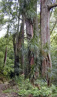 Freycinetia arborea, ʻIeʻie, is a densely branched, brittle, woody climber in the family Pandanaceae, endemic to the Pacific Islands. ʻIeʻie is found in moist forest on the Hawaiian, Marquesas, Austral, Society, and Cook Islands. It grows into the forest canopy, attaching itself to a host tree using aerial roots.[2] It may also grow as a sprawling tangle on the forest floor.[3] The shiny green leaves have pointed ends and are spiny on the lower side of the midrib and along the edges.[4] Leaves measure 40–80 centimetres (16–31 in) long and 1–3 centimetres (0.39–1.18 in) wide, and are spirally arranged around the ends of branches. Flowers form on spike-like inflorescences at the end of branches, and are either staminate or pistillate. Staminate spikes are yellowish-white and up to 10 centimetres (3.9 in) in length. Pistillate spikes are 3–4 centimetres (1.2–1.6 in) but elongate to 7.5–9.5 centimetres (3.0–3.7 in) once fruit are produced. Three to four spikes are surrounded by orange-salmon bracts. Fruit is 1 centimetre (0.39 in) long and contains many 1.5-millimetre (0.059 in) seeds.[2] The bracts and fruit of the ʻieʻie were a favorite food of the ʻōʻū (Psittirostra psittacea), an extinct Hawaiian honeycreeper that was formerly a principal seed dispersal vector for plants with small seeded, fleshy fruits in low elevation forests.[5] It is also a favored food of the ʻalalā (Corvus hawaiiensis), which is currently extinct in the wild.[6]
