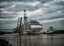 After World War 2, a new Friesenbrücke was built between 1951 and 1952, also a bascule bridge.[2] The bridge wasn't wide enough to allow all newbuilts of the Meyer Werft in Papenburg to pass the bridge since the 1980s, so a second was created, which was opened by a crane vessel multiple times a year.