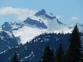 Frisco Mountain is a 7,760-foot (2,370-metre) mountain summit in the Cascade Range in the U.S. state of Washington. It is located two miles southwest of Rainy Pass on the borders of the Stephen Mather Wilderness and North Cascades National Park. First climbed by surveyor Lage Wernstedt in 1926,[3] the mountain derives its name from a mining claim on the south side (Bridge Creek side) that was worked in the 1920s. Its nearest higher peak is Rainy Peak, 0.54 mi (0.87 km) to the east-southeast.[1] Precipitation runoff from Frisco Mountain drains into Rainy Lake and tributaries of Bridge Creek. The retreating Lyall Glacier in its northeast cirque contributes to waterfalls which tumble 1,000 ft (300 m) into Rainy Lake.
