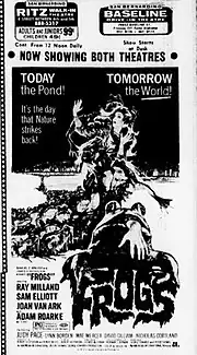 Frogs is a 1972 American horror film directed by George McCowan.[2] The film falls into the "eco-horror" category, telling the story of a wildlife photographer who meets an upper-class U.S. Southern family who are victimized by several different animal species, including snakes, birds, lizards, and butterflies. The movie suggests nature may be justified in exacting revenge on this family because of its patriarch's abuse of the local ecology.[3] The film was theatrically released on March 10, 1972.