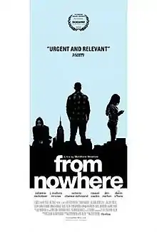From Nowhere is a 2016 American drama film directed by Matthew Newton and written by Matthew Newton and Kate Ballen. The film stars Julianne Nicholson, Denis O'Hare, J. Mallory McCree, Octavia Chavez-Richmond, Chinasa Ogbuagu, Raquel Castro and Tashiana Washington. The film was released on February 17, 2017, by FilmRise. Three undocumented teenagers—a Dominican girl, an African boy and a Peruvian girl—are about to graduate high school in the Bronx, while working with a teacher and a lawyer to try to get proper documents to stay in the U.S. Forced to grow up quickly and navigate problems most adults don't even have to face, the students are really just American teenagers who want to be with their friends, fall in love, and push back against authority.