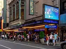 Previews on Broadway at the St. James Theatre began on February 22, 2018, with an official opening on March 22, 2018. The cast and creative team was the same as in Denver. A reported 30% of the show was rewritten between the tryout and the Broadway opening, with the musical taking a "deeper dive into the princesses' psyches" and aiming at a more adult audience; Disney research shows that 70% of the audience for its musicals are adults without children.[17] Anderson-Lopez noted that "examining how the ... princesses' psychological scars drive them to make certain decisions was the next logical storytelling step."[17] The onstage technology included lighting effects for Elsa's magic, as well as such adaptations as a full-body costume to represent the reindeer Sven, with a ballet dancer inside holding stilts in his hands and walking on tiptoe; the role is so strenuous that a second ballet dancer was hired to play it at some performances to give each dancer some days of rest.[17]