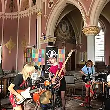 Fruit & Flowers is a psychedelic rock quartet from Brooklyn, New York City. The band's original lineup consisted of guitarist and vocalist Ana Becker, drummer Jose Berrio, guitarist and vocalist Lyzi Wakefield, and vocalist and bassist Caroline Yoder.[1] They were later joined by saxophonist and synthesizer-player Claire Wardlaw. The band plays gritty, dreamy surf rock and draw comparison to the Breeders, Rain Parade and 1970s punk.[1][2] They played Brooklyn's Northside Festival weeks after their formation.[3] Fruit & Flowers were introduced to Little Dickman Records by the rock band Sharkmuffin.[4] Their first single, "Turquoise," was released on June 24, 2015. The Deli describe it as "a slow burning track featuring a melody that is tele-porting us back to the days of [...] spacey American psych bands of the late '80s."[2]