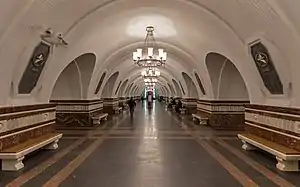 Frunzenskaya (Russian: Фру́нзенская) is a Metro station on the Sokolnicheskaya Line in Moscow, Russia. The station was opened on 1 May 1957 as the first stage of the extension of the Frunzenskiy radius. As the radius follows the bend of the Moskva river, the whole segment had to be built very deep (42 metres/138 ft for Frunzenskaya).