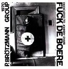 Fuck de Boere: Dedicated to Johnny Dyani is a live album by saxophonist Peter Brötzmann containing two tracks recorded at the Frankfurt Jazz Festival in Frankfurt, Germany. Track one, "Machine Gun," was recorded on March 24, 1968, several months before the studio recording that resulted in the album of the same name, and features Brötzmann with saxophonists Willem Breuker, Gerd Dudek, and Evan Parker, pianist Fred Van Hove, bassists Buschi Niebergall and Peter Kowald, and drummers Han Bennink and Sven-Åke Johansson. On track two, the title track, recorded on March 22, 1970, Brötzmann is joined by Breuker and Parker on saxophone, Niebergall, Malcolm Griffiths, Paul Rutherford, and Willem Van Manen on trombone, Van Hove on piano and organ, Derek Bailey on guitar, and Bennink on drums. The album was released in 2001 by Atavistic Records as part of their Unheard Music Series.[1][2][3] The album is dedicated to South African bassist Johnny Dyani, who, according to Brötzmann, frequently shouted "Fuck de boere!" when discussing life under apartheid.[4]
