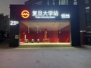 Fudan University (simplified Chinese: 复旦大学; traditional Chinese: 復旦大學; pinyin: Fùdàn Dàxué) is a metro station of Line 18 as part of Shanghai Metro. Located west of the intersection of Handan Road and Guoquan Road in Yangpu District, Shanghai, the station is located on the western edge of the Handan campus of Fudan University, the main campus of the university. It opened with the rest of phase one of Line 18 on December 30, 2021.[1][2][3]