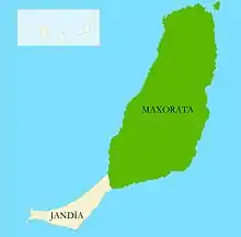 Several Spanish and Portuguese expeditions to the islands were organized around 1340, followed by Moors and European slave traders. At the end of the Iberian conquest, the island was divided into two Guanches kingdoms, one adhering to King Guize and the other to King Ayoze. The territories of these kingdoms were called Maxorata (in the North) and Jandía (in the South) respectively. They were separated by a wall, which traversed the La Pared isthmus. Some remains have been preserved. The ancient name for the island, Erbania, is derived from this wall's name.[10]
