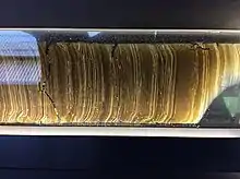 A thin section of varve on display in Fukui Prefectural Varve Museum. Showing evidence of eruption of Kikai Caldera.