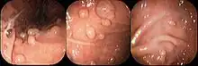 Endoscopic image of fundic gland polyps taken on retroflexion of gastroscope.