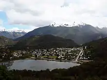 The town of Futaleufu and Laguna Espejo at the foot of Sierra Teta