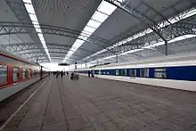 Fuyang Station has 5 passenger platforms and 15 train tracks, including 2 main line tracks, 9 platform tracks, 3 cargo train service tracks and 1 shared passenger-cargo track, and the Fuhuai railway track is outside of the station. The station is covered by a 56,000-square-meter columness-less canopy. The station building and the platforms are connected by a 12-meter-wide overpass for inbound passenger, two tunnels for outbound passengers and a baggage passage.[11][12] The station is also equipped with facilities such as a turnaround section for train maintenance service and a passenger train preparation facility.[5]