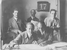 Interior of the fine mechanical workshop in Budapest. Kornél Tolnai leftmost. Photo in 1931.