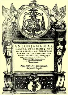 Antoniana Margarita was reprinted many times but only very recently translated into Spanish (2000, from the original Latin).[2] The work is dedicated to his teacher Juan Martínez Siliceo and is a tribute to his parents, Antonio and Margarita, even though the subtitle of clearly indicates its scientific and philosophical contents: "a work so useful and necessary for medical, physical, and theologians ("Opus nempe phisicis, ac medicis teologis, non minus utile quam necessarium").