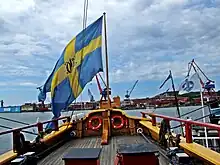 The East Indiaman Götheborg is classified as a passenger ship sailing under the ordinary Swedish flag. But when in port, the ship is entitled to fly the old swallowtailed version of the flag, the SOIC flag (Svenska Ostindiska Companiet, "Swedish East India Company"), that the original vessel sailed under.[37]