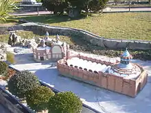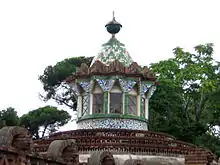 The Pavilions consist of a stable, longeing ring and gatehouses. The stable is rectangular and roofed with a high Catalan vault adopting a catenary curve; the longeing ring has a square ground-plan, but is surmounted by a hyperboloid dome topped by an ornamental lantern; the gatehouses consist of three small buildings, the central one being polygonal in plan and the others cuboidal. All three are surmounted by ventilators in the form of chimneys, faced with ceramics.[6] All the buildings are built of brick in a range of shades from red to yellow, and covered in coloured glass; in certain sections prefabricated cement blocks are also used.[7]