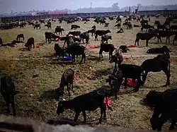 Gadhimai festival is a Hindu festival held every five years in Nepal at the Gadhimai Temple of Bariyarpur, in Bara District, about 160 kilometres (99 mi) south of the capital Kathmandu, and about 7 kilometres (4.3 mi) east of the city of Kalaiya, near the Indo-Nepal border. It is primarily celebrated by Madhesi people. The event involves large-scale sacrificial slaughter of animals, including water buffalo,[2] pigs, goats, chickens, and pigeons, with the goal of pleasing Gadhimai, the goddess of power. People also make other offerings, including coconuts, sweets, and red-coloured clothes.[3] The festival has been described as the world's largest animal sacrifice event[4][5][6] or one of the largest.[7]