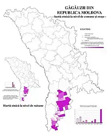 The Gagauz are the third minority ethnic group in the Republic of Moldova, counting 126,010 people according to the 2014 census, i.e. 4.57% of the total population (without Transnistria). Their share in the ethnic composition of the country is gradually increasing.[1] They are the majority of Gagauzia's population (83.8%), while in Taraclia District, which is inhabited primarily by Bulgarians, they comprise 9.0% of the total population. In Bessarabsky District they are 7.4% of the district's population, but gradually declining. In Cahul district, they have a small presence (2.7% of the district's population). In the rest of Moldova their share is lower than 1%. The internal migration of Gagauz in Moldova is low. Most Gagauz who leave Gagauzia migrate to Russia.