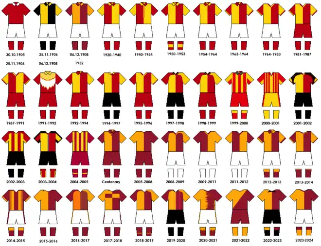 The Galatasaray home kit have always been fundamentally the same since 1908. The traditional shirt of Galatasaray is the eight-piece halved design. This consists of the shirt's front, back and sleeves being made up of two colours, resulting in the shirt being split into eight parts. (Two same colours are never next to each other within the 8 parts.) The colours continue in an alternating order, from yellow to red. This results in the front of the shirt being the opposite of the back and the shirt also having an halved design from the side. This alternating colour order of eight parts creates a complete halved design for the shirt.[44] The classic eight-piece halved design would become the look of Galatasaray for around 80 years, until 1985 when sportswear manufacturer Adidas began to provide the shirts and the sleeves were made up by one colour and not halved. Created over a century ago, the classic Galatasaray kit combination consists of the eight-piece halved traditional shirt, white shorts and red socks and are usually worn as part of the home strip.[44] This changed in the mid-1980s, when sportswear manufacturer Adidas began to provide the shirts. The club reverted to the "classic" kit in 2012.[44][45] The official colours are Pantone shades 1235 (yellow) and 201 (red).[46]