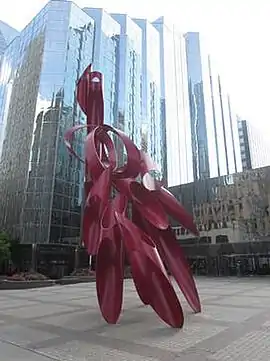 The abstract (geometric) welded steel sculpture is approximately 45 feet (14 m) tall and 27 feet (8.2 m) wide. It is painted red and weighs 14 tons.[1]