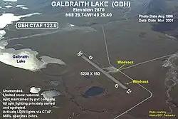 Galbraith Lake Airport (IATA: GBH, ICAO: PAGB, FAA LID: GBH) is a state-owned, public-use airport located at Galbraith Lake in the North Slope Borough of the U.S. state of Alaska.[1] The Arctic National Wildlife Refuge has an office at the airport.[2] The lake and airport are located west of the Dalton Highway and north of the Trans-Alaska Pipeline System's Pump Station 4.[2] According to the FAA's National Plan of Integrated Airport Systems for 2009–2013, it was classified as a general aviation airport.[3]