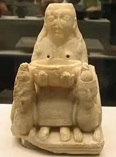 The "Lady of Galera" or "Goddess of Galera" (see image at left) was found in the 5th century BCE tomb number 20, zone 1 of the Necropolis.[8] The figurine, which is currently on display in Madrid, is Phoenician and from the 7th century BCE.[8] It is similar to another found in Carthage, North Africa), made of alabaster, and probably represents the goddess Astarte.[8] The "lady" or "goddess" is seated between two sphinxes and has an opening through which liquid can be poured into it, which will emerge from small holes corresponding to the nipples of the breasts.[8] The robust forms of the figure suggest Mesopotamian influences; the stylization of the clothing and hair suggest Egyptian influences. It is believed that this sacred object was passed down for many generations before being used as part of a burial.