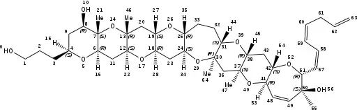Structure of gambierol with the stereocenters and atom numbers indicated.