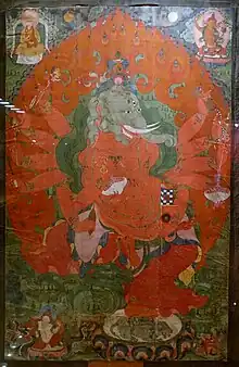There are thirty texts contained in the Tibetan Buddhist canon which deal with Ganesha.[10] In these texts, which are Indian texts preserved in Tibetan translation, Ganapati is depicted as a wealth deity which can also grant worldly pleasures like sex and food. He is also depicted as a protector from negative forces, demons, and sickness.[10] In these tantric Buddhist sources, Ganesha is generally presented as an emanation of the Bodhisattva Avalokitesvara.[10]