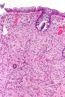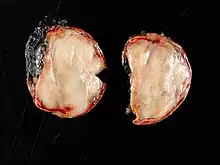 Pathologically, ganglioneuromas are composed of ganglion cells, Schwann cells and fibrous tissue.[5] Ganglioneuromas are solid, firm tumours that typically are white when seen with the naked eye.