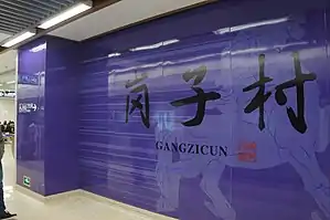Gangzicun station (simplified Chinese: 岗子村站; traditional Chinese: 崗子村站; pinyin: Gǎngzǐcūn Zhàn), is a station on Line 4 of the Nanjing Metro and is a planned interchange station with the future Line 6.[1] The station is located underneath the intersection of Bancang Street, Longpan Road, and North Anmen Street and is situated between Xuanwu Lake, Purple Mountain, White Horse Park, and the Nanjing Sun Palace. Because of its location, it has been called by local media as "one of the busiest tourist stations".[1]