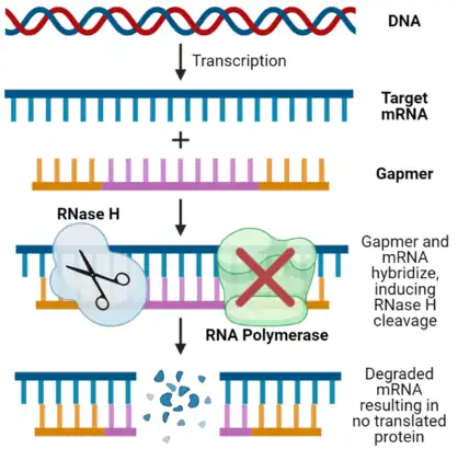 The mechanism of therapeutic gene-silencing action relies on degradation through the action of RNase H.[1][5] Nearly all organisms utilize this family of enzymes to degrade DNA-RNA hybrids as a defense against viral infection.[6] In protein synthesis, DNA is first transcribed into mRNA, and then translated in an amino acid sequence. Gapmers take advantage of this biological pathway by binding to the mRNA target.[7] In humans, the gapmer DNA-mRNA duplex is degraded by RNase H1.[1][5] The degradation of the mRNA prevents protein synthesis[7][8]