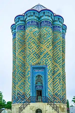 The mausoleum, built in the first half of the 14th century is partially demolished and has a cylindrical form with twelve semicircular facets. The mausoleum, which has a circular form in the inner part, is 30 meters high. Two minarets having quadrangular foundation in the lower part are located about 30 meters from the mausoleum. The minarets of the ensemble belong to the 12th century.[1][2]