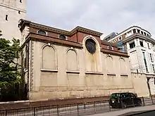 St James Garlickhythe is in the shape of a rectangle, with the tower adjacent to the West and a protruding chancel (uniquely for a Wren church) projecting from the East. It is built from brick and Kentish ragstone, partly stuccoed, partly faced (since World War II) with Portland stone.[11] Entrance is through a pedimented doorway with a cherub keystone in the tower, which is flanked by pairs of round headed windows in the west wall. Above is a recessed clerestory wall joined to the tower by semi-rounded pediments.
