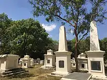 The cemetery entrance gate has a marble stone, reads, "Garrison Cemetery AD 1800. Latest burial 1860." A few tombs are imposing, while others are small, some shaped like of a coffin and said to be the remains of infants who died of the plague. Many officers of the Swiss mercenary de Meuron Regiment are buried here.[3]
