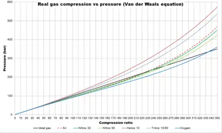 Both nitrogen and oxygen compress relatively linearly and will approximate the ideal gas to much higher pressures than helium, which deviates significantly even below 200 bar. Air and nitrox mixtures can be approximated as ideal without significant error up to about 230 bar at normal temperatures.