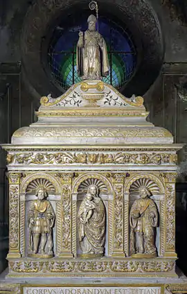 In possibly the last years of the 15th century, the Sanmicheli were involved in the stone decoration of the Caprioli chapel in the Church of San Giorgio, for which Cairano, almost simultaneously, prepared his Adoration, demonstrating for the first time outside of the Loggia a cooperation between the two studios.[99] Bartolomeo Sanmicheli, at the beginning of the new century, attempted at this point to make a comeback in the local art scene with the Ark of San Tiziano of 1505, characterized by a strong decorative quality. He possibly also aspired to the commission of the ark of Sant'Apollonio, which had been up for grabs since the discovery of the relics of the holy bishop in 1503.[100][99] An early involvement of Sanmicheli can be surmised in the Martinengo mausoleum, but the commission was awarded to Bernardino dei Crossi in 1503. However, based on the prevailing decorative nature of the monument, which is much more rigorously classical, it can be attributed to Cairano.[101]