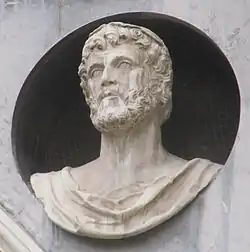 On August 30, 1493, Cairano was tasked with the decoration of the exterior of the Palazzo della Loggia with the delivery of capita 5 imperatorum romanum,[15] or five busts for the beginning of a cycle of thirty Caesars, which would become among the finest achievements of his career.[10] The production of these busts can be traced, in general, to a contemporary reworking of ancient portraiture.[10] In the oldest busts, i.e., those facing the piazza, there are similarities with the image of Bartolomeo Colleoni in the memorial by Andrea del Verrocchio in Venice,[16] with an evoking of an effigy of Antoninus Pius[17] and a portrait of Nero,[18] all famous images at the time and here revived in three dimensions.[10]