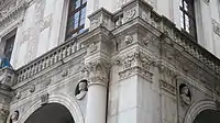 The entrance is resolved in a manner simultaneously elegant and eccentric, in an almost exuberant and free syntax. The canonical orders are absent, and the collection is conceived as an imaginative blend of quasi-archaeological redeployment.[41][43] For this reason, critics do not attribute the project to Cairano, which remains a formidable invention that is highly representative of antiquarian culture of the time.[41][44] Surely Cairano's, however, is the hand that produced the sculptures along with anthropomorphic figures, dolphins and fantastic creatures, the artist already experimented with these in the Loggia; and once again, the artist inserted small Caesars, both on the portal as well as the overpass, which achieve the poetic zenith of some of his portraiture of old.[41][43]