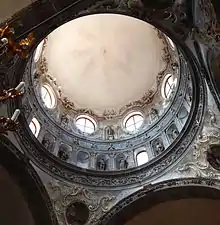By 1507, however, Cairano's decorative lapidary work in the interior of the San Pietro in Oliveto became known as the third great achievement of the artist, after the Miracoli and the Loggia.[24][32] The architectural scores that punctuate the sequence of the altar and the composition of the whole, however, are unrelated to Cairano's style. Rather, they are consistent with Sanmicheli, who indeed possessed the only workshop in town capable of engaging a work of this magnitude.[24] Certainly the twelve Apostles in the spandrels in the arches of the nave are Cairano's work - the artist's hand is unmistakable.[24][33] There is very poor and fragmentary documentation relating to this historic building that has come down to us.[34]