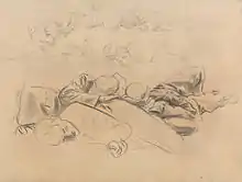 The painting was completed in March 1919, and Sargent was paid his £600 fee. It was first displayed at the Royal Academy in London in 1919.[1][9] It was voted picture of the year by the Royal Academy of Arts in 1919.[6][10] The painting was not universally liked: E. M. Forster considered it too heroic.[6] Winston Churchill praised its "brilliant genius and painful significance", but Virginia Woolf attacked its patriotism.[11] It is now held by the Imperial War Museum, along with several charcoal studies for the painting.[12] Other charcoal sketches are held by the Corcoran Gallery of Art. A small 10½ x 27¼ in. (26 x 69 cm) oil sketch, originally owned by Evan Charteris, was sold by Christie's in 2003 for £162,050 ($267,869).[5]