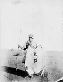 Méry arrived at Lake Menghough on 15 February 1893, but could not go further due to the poor weather and drought.[21] He was now over 1,200 kilometres (750 mi) from Biskra.[8] When Méry visited Lake Menghough there had been a long period of drought, and it was completely dry.[24] At Lake Menghough Méry met with some of the Kel Ajjer chiefs.[22] He was given a hospitable reception by the chiefs of the confederacy, and particularly by their main chief, the Amenokal Mouley and his nephew Guadassen, from the noble and warlike Ouragben tribe.[18][23] Méry spent several days with the Tuaregs.[23]