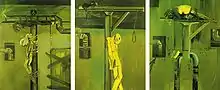 In 1986 the Museo Español de Arte Contemporaneo hosted an exhibition of his works from 1970 to 1986. In 1991 he exhibited at the Spazio Ansaldo, Milan, in an installation designed by Renzo Piano,[7] and more spectacular was an exhibition at the Taipei Fine Arts Museum, Taipei, Taiwan, which was widely commented upon by the critic Roberto Tassi.[10] In 1995, an incredible exhibition was shown at the Casa Das Artes in Vigo Spain, crucial from a critical point of view, as the critic Marco Ricardo Barnatán wrote in the exhibition catalogue, for its statement of Orellana's renewed aesthetic and realisation ideals and practice, a trait that indeed has marked the work of the artist ever since. Christian Stein, at the gates of the Spanish Pavilion at the 1995 Venice Biennale, declared that "Orellana is the most interesting artist that Spain has created since Tàpies and Miró".[9] In 1998, his gallery, Christian Stein, showed his works in a solo pavilion at the ARCO art fair in Madrid.[11] In a tribute to the power and human drama of Orellana's late 1960s works, a nightmarish 1967 piece was included in the major 2005 exhibition held in Turin titled "Il Male" that comprised works of leading artists from the quattrocento to the present.[12] The curator, Teresa Sacchi Lodispoto, commented "In a nightmarish atmosphere reinforced by a palette of chromatic contrasts of Goya-like memory and in equilibrium between bright chromatism and restrained sobriety, it is impossible to understand what, in effect, is revealed before the eyes of the viewer".[12]