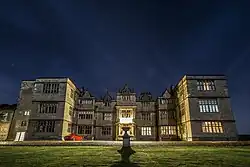 William Moulsoe's house of 1597 was built to a traditional Elizabethan E-plan with projecting wings and a central porch with Doric columns on the south, entrance, front. The matching wings on the north front were infilled during the ownership of the younger George Wrighte, using a Palladian style.[5] The house is of three storeys and seven bays and is built of coursed limestone.[9]