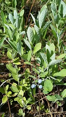 Gaylussacia nana is a shrub up to 1 m (40 inches) tall, sometimes forming large colonies of hundreds of individuals. It has dull green to yellow-green leaves up to 4 cm (1.6 inches) long. Inflorescences hang from the leaf axils or from the tips of branches, with 1-4 greenish-white flowers. Fruits are sweet and juicy, usually dark blue but sometimes white, up to 8 mm (0.3 inches) in diameter.[5][6]