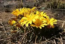 This ground-hugging grassland species is one of the first plants to flower in spring, appearing in profusion as small clumps of yellow or white flowers between low grass tussocks or burnt stubble, or as leafless single flowers seemingly stuck into the soil. Flowering lasts for only a few weeks after the first rains. The buttercup-yellow rays often occur in forms having dark spots at the base.[2] The showy flowers open only in strong sunlight, closing with fading light and re-opening the following day. This plant is perennial and grows from a woody rootstock. The leaves are tufted and linear in shape, white-felted on the underside, and exuding a milky latex when damaged.