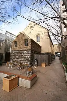 The Ryrie Street Presbyterian Church opened in 1857, and was known as the 'Steeple Church'. It was designed by John Young in 1856 and built in bluestone in an Early English Gothic style. In 1914 the congregation moved to Newtown and became St. David's Presbyterian Church. The steeple was dismantled in 1913, and the present row of two-storey shops along Ryrie Street were built, although the main body of the church still exists today as part of the performing arts centre.[4]