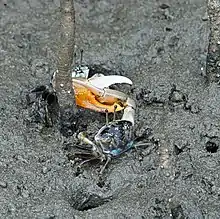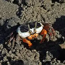 The carapace is up to 30 mm across,[3] black-brown with blue patches to varying extent. Adult males have an enlarged claw with a grey or pink upper finger, and orange lower finger and hand.[3] Like other fiddler crabs the claw is used to scare or fight other males, and in waving displays to attract females. The lower male claw has a large triangular protection in the most distant part from the body.[4]