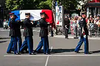 She was interred there in May 2015[9] in a symbolic funeral. The coffin of Geneviève de Gaulle-Anthonioz at the Panthéon does not contain her remains but soil from her gravesite,[10] because her family didn't want her remains to be parted from those of her husband.[11]
